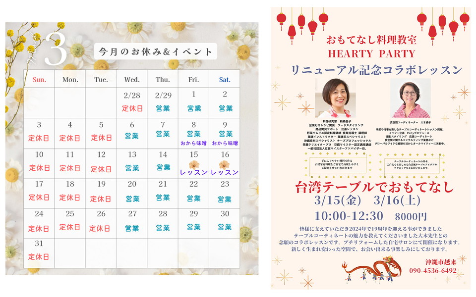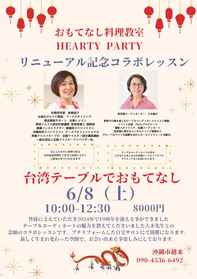 大学卒業後、総合建設業で就職後、オーストラリアで出会った沖縄出身の夫との結婚を機に沖縄移住スタート。2000年より移住し、観光ホテルで働いた後調理師を取得、次男出産後自宅にて「おもてなし料理教室 HEARTY PARTY」主催。口コミで生徒数は増え19年目を迎える。ワインソムリエである夫の経営するレストラン「ワイン食堂 IPPEI」を支えつつ、男の子3人の母親として日々奮闘中。